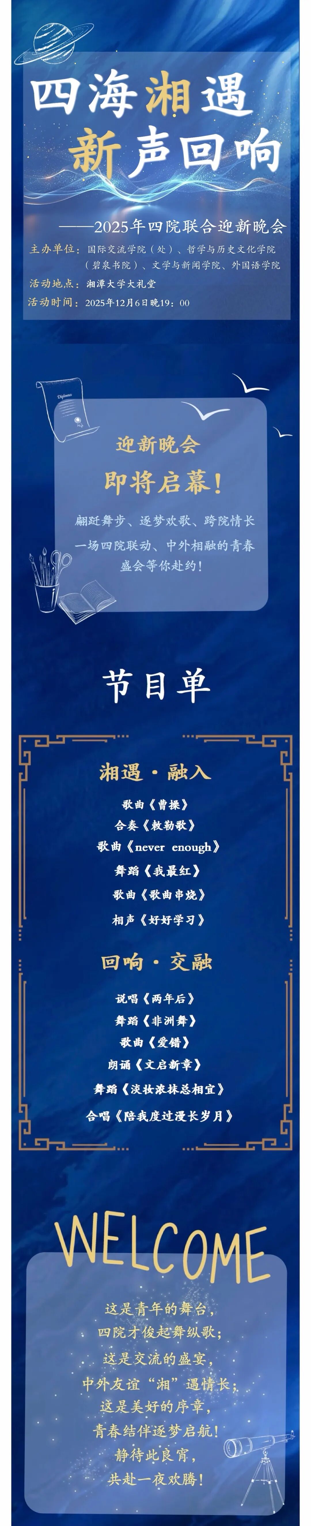 四海湘遇·新声回响——2025年四院联合迎新晚会期待你的到来