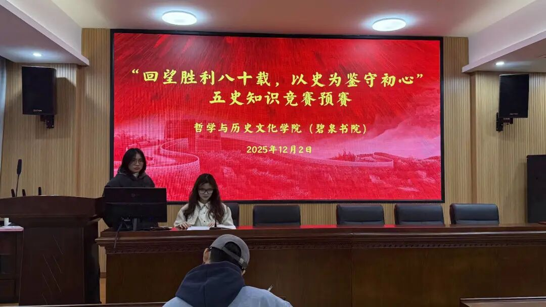 为纪念中国人民抗日战争暨世界反法西斯战争胜利八十周年,引导师生铭记历史、坚守初心,漫画18 “回望胜利八十载,以史为鉴守初心”五史知识竞赛选拔赛12月2日19:00在毛研楼东506顺利举行。