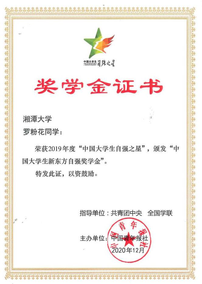 学子罗粉花荣获2019年度“中国大学生自强之星”,并获得“中国大学生新东方自强奖学金”。
