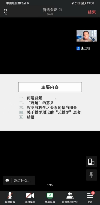 11月22日晚,山西大学江怡教授作客碧泉讲坛之名家讲堂,以腾讯会议的形式作了题为“分析与思辨:两种不同的哲学传统”的学术报告,讲座由院长陈代湘教授主持,200余名师生聆听了报告。