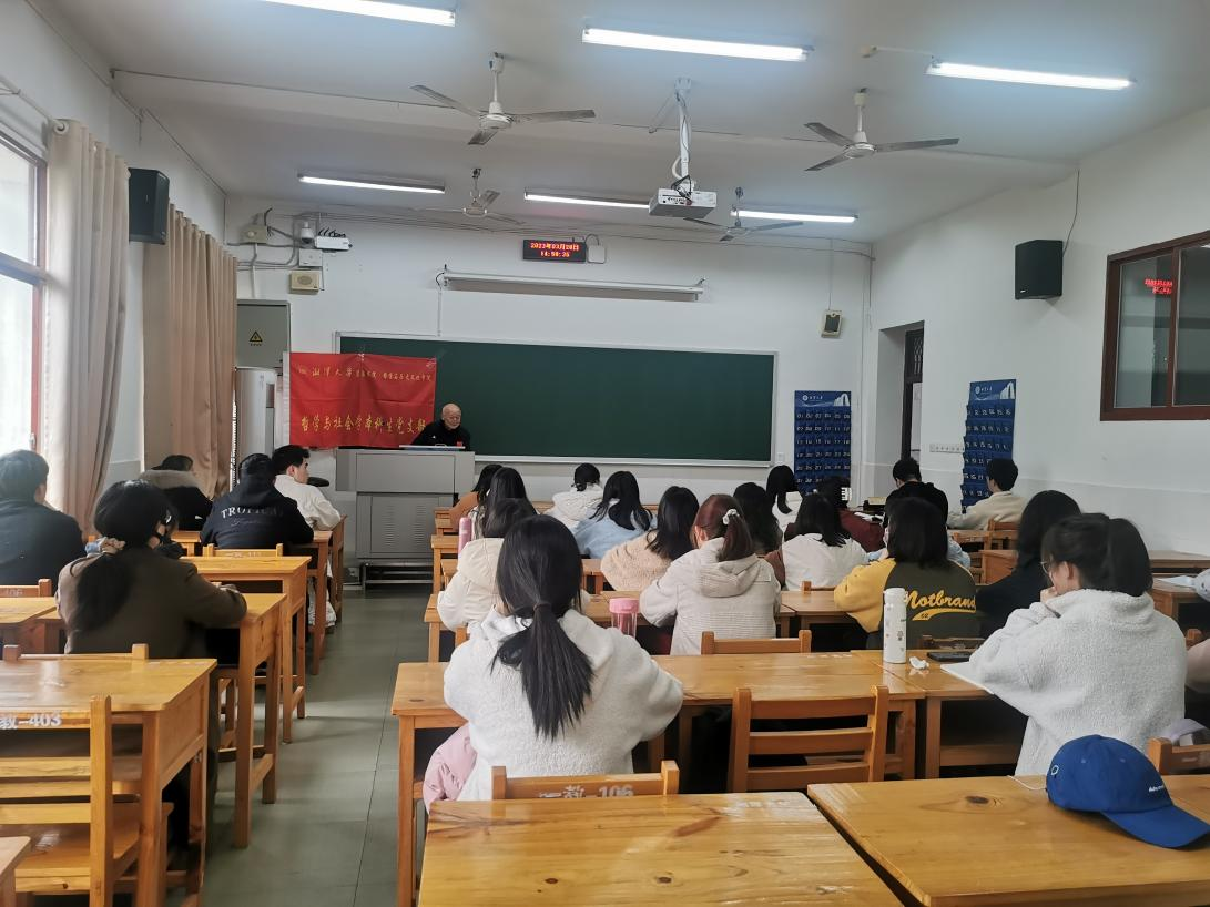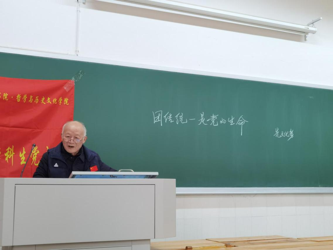 关心下一代工作委员会副主任、中共党史专业退休教师刘松茂教授于第一教学楼406教室为哲学与社会学本科生党支部全体党员讲授“团结统一是党的生命”主题党课。