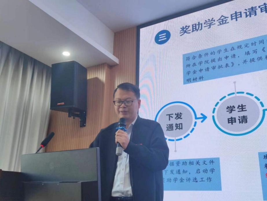 奖助学金体系。特别强调了在班级投票阶段要推荐合适人员经班级公示无异议后,再推荐至学院进行初审,切忌简单以班级同学投票决定。其次,许红军老师介绍了家庭经济困难认定的等级、材料、流程,提醒各位班主任一定要按照流程并注意关注班级的学生,了解学生的状况,让家庭经济困难的评定公开、公正。最后,警示各位班主任在进行资助时要保护好同学们的身份信息,避免不法分子对学生实施欺诈行为。