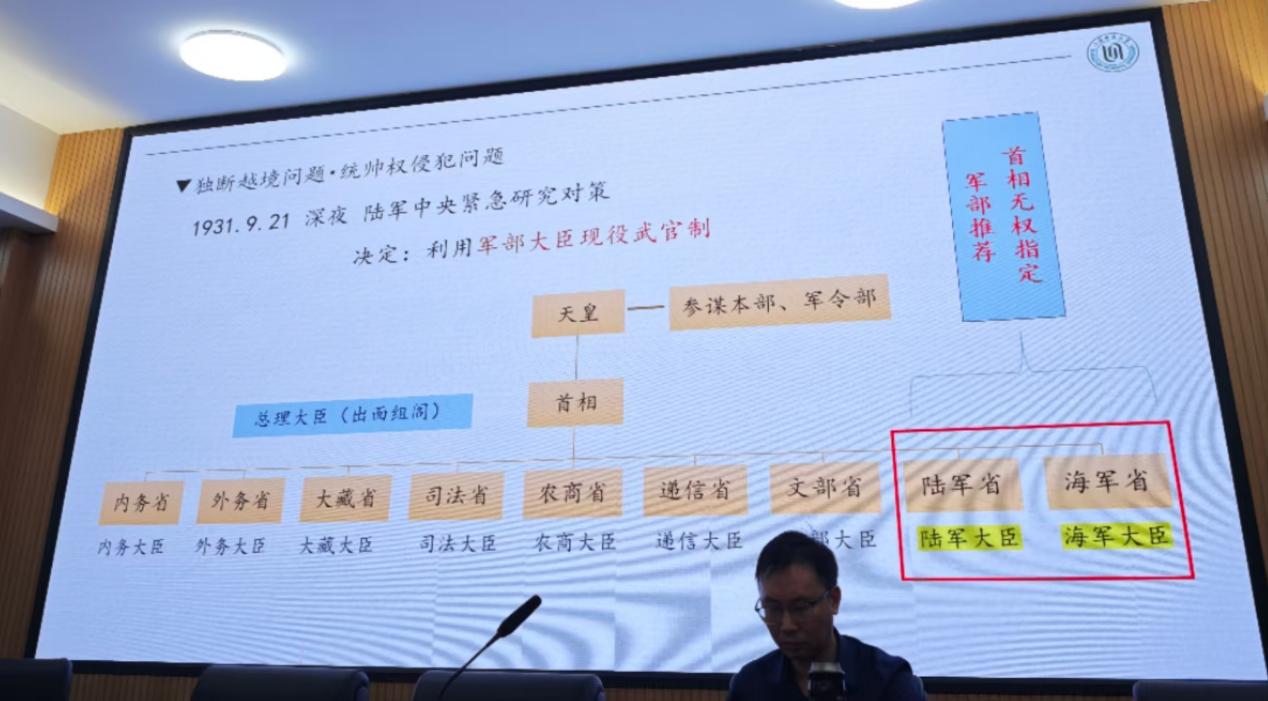 讲座重点分析了日本政治与军事关系的内在矛盾。军部大臣现役武官制使得文官政府无法有效节制军队,纵容军部扩权以及日本关东军、朝鲜驻军在中国东北地区军事扩张。昭和天皇本人虽拥有终止军事行动的权力,但并未明确表态制止,这实际上亦是对事变的默许。
