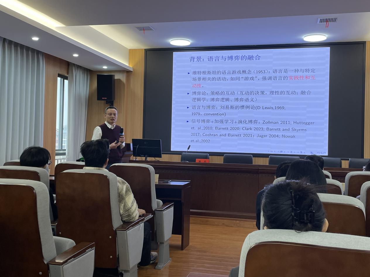 讲座伊始,熊卫教授系统阐述了博弈论在语言哲学研究中的重要应用。他从维特根斯坦的“语言游戏”概念和刘易斯的“惯例论”出发,介绍了语言与博弈融合的理论背景。随后,熊教授深入讲解了博弈论的基本模型,包括个体理性、策略型博弈、纳什均衡等核心概念,并重点分析了信号博弈模型及其在语言意义形成过程中的解释力。通过对经典的“2×2×2信号博弈”和“悉尼爵士博弈”的细致剖析,熊教授生动展示了如何运用博弈论工具来理解意义的生成、信号的传递以及言语交流中的策略互动。他指出,语言的意义是在互动中形成的稳定状态,有效的交流常对应于博弈中的“分离均衡”,而“混同均衡”则可被理解为语言含糊性的一种表现。
