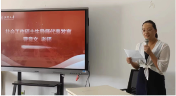 老生代表2021级社会工作冯源源同学用自己的成长经历与新生们共勉:“当我感到迷茫和不知所措时,我内心的答案是“干就完事儿”,也希望你们能充分利用学校资源,在老师的指导下、在团队的协作下,驰骋竞赛的沙场,斩获耀眼的佳绩,成为大学生活中的“C位”,社会实践的主角。?/span>